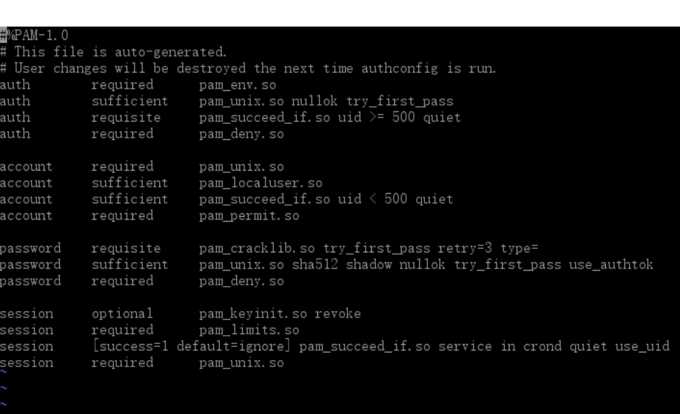 修改/etc/pam.d/system-auth配置:(注意:在root用户下进行,其余用户对这个文件只有读的权限)