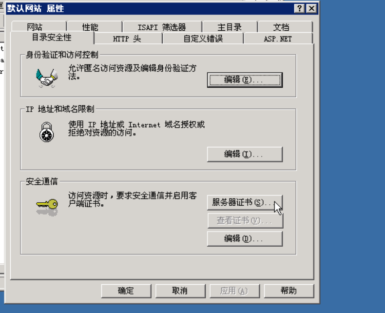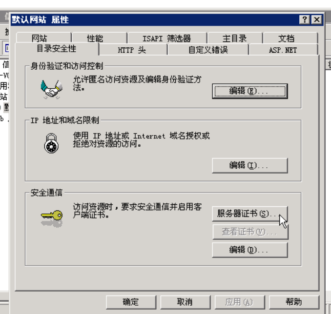 再进入到默认网站属性,选择“目录安全性”,单击“服务器证书”: