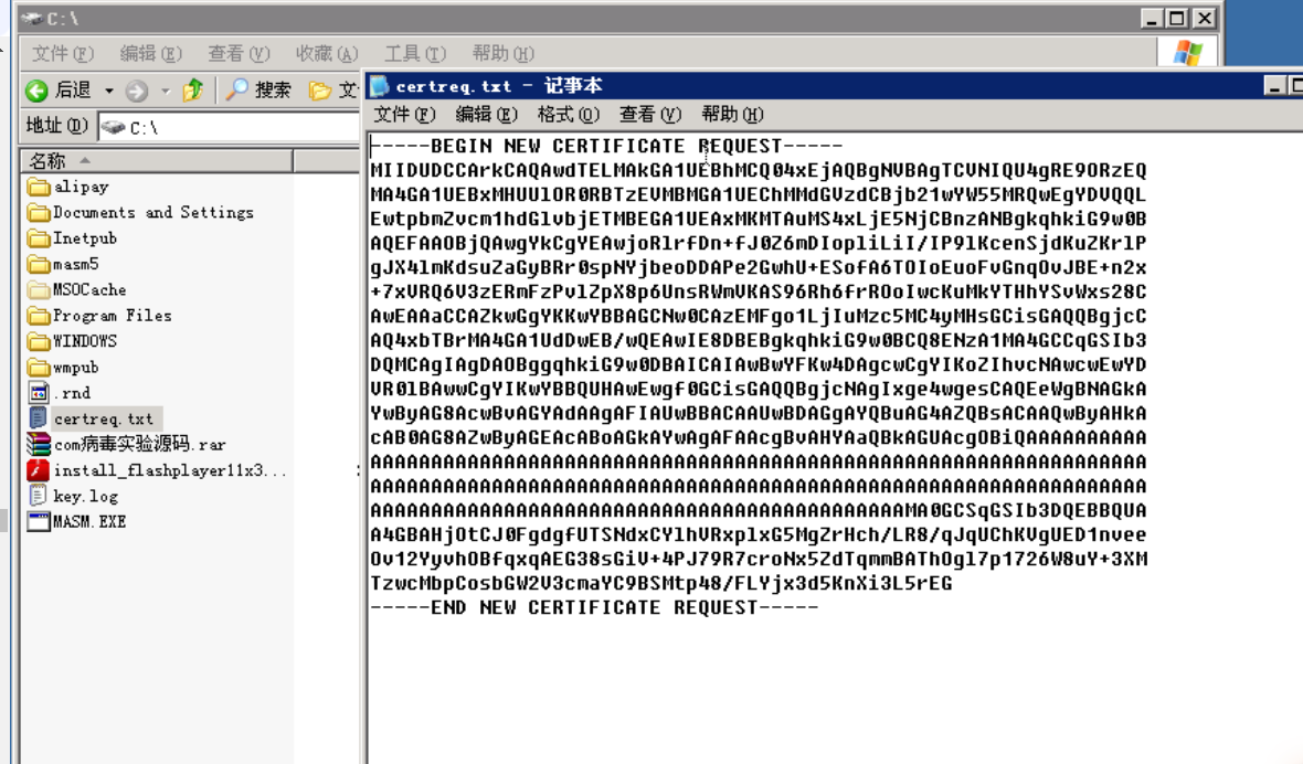 打开前面步骤建立的文本文件certreq.txt,将文本文件的内容复制到页面中,并提交: