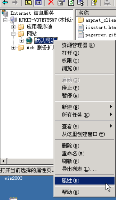 安装完成后,打开IIS,右键“默认网站”,选择“属性”: