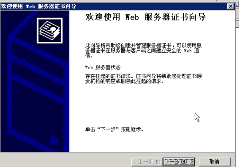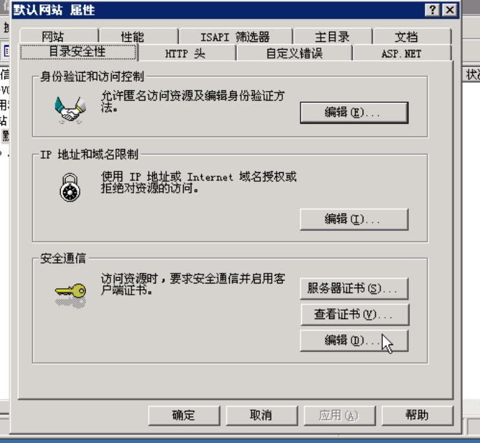 再进入到默认网站属性,选择“目录安全性”,单击“服务器证书”