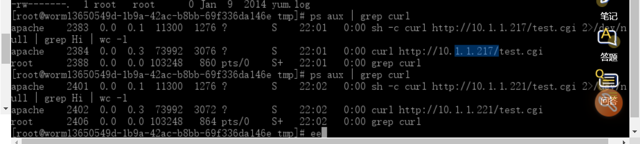 1.登录Worm1(10.1.1.12),不断的执行命令:“ps aux |grep curl”可以看到蠕虫的传播过程,被感染的Worm1通过agent.1337进程,不断的向同网段的其他主机发起攻击与感染。如下所示: