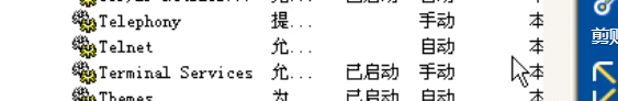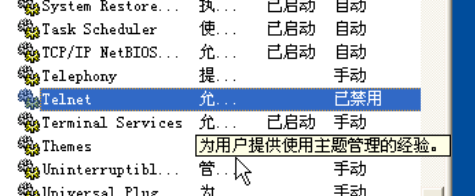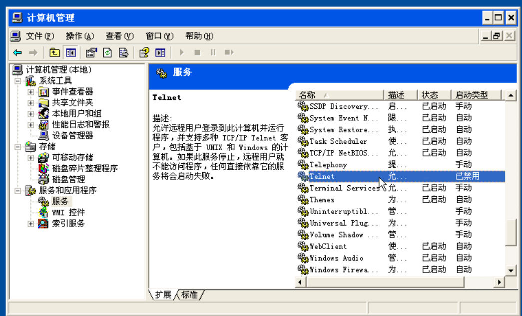 (3)右键“我的电脑”->管理->服务和应用程序->服务,找到Telnet服务,关闭之:
