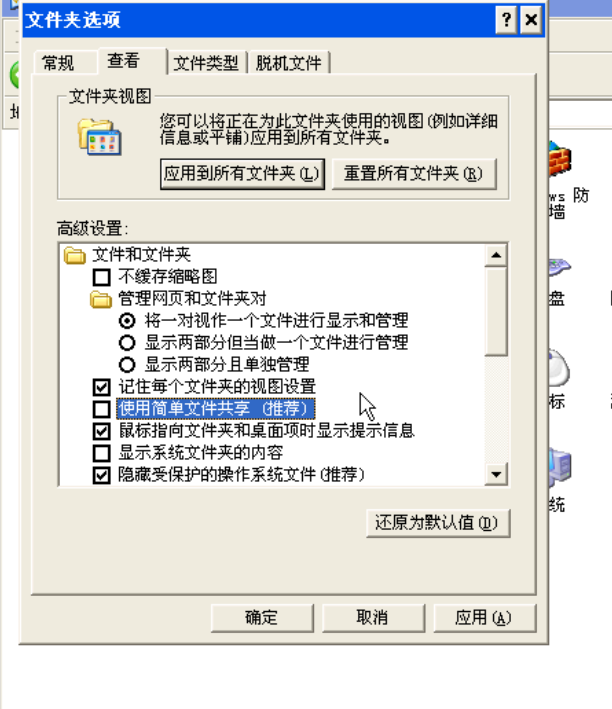 (2)在主机B的“控制面板-工具-文件夹选项-查看-简单的文件共享”去掉选取。