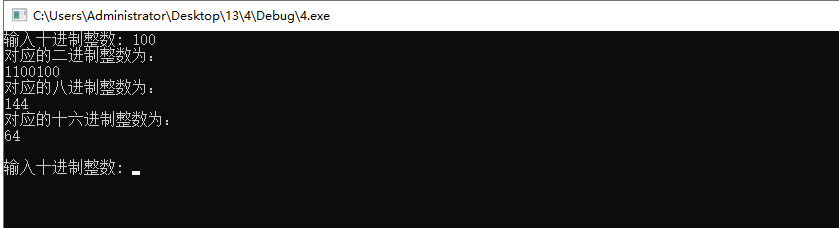 1 #include <stdio.h> 2 #define N 100 3 void dec_to_n(int x, int n); 4 5 int main() { 6 int x; 7 8 while(printf("输入十进制整数: "), scanf("%d", &x) != EOF) { 9 printf("对应的二进制整数为:\n"); 10 dec_to_n(x, 2); 11 printf("对应的八进制整数为:\n"); 12 dec_to_n(x, 8); 13 printf("对应的十六进制整数为:\n"); 14 dec_to_n(x, 16); 15 16 printf("\n"); 17 } 18 19 return 0; 20 } 21 void dec_to_n(int x, int n){ 22 char map[]="0123456789ABCDEF"; 23 char ans[N]; 24 int d,r; 25 int i=0; 26 while(1){ 27 r=x%n; 28 d=x/n; 29 ans[i++]=map[r]; 30 31 if(d==0) 32 break; 33 34 x=d; 35 36 } 37 for(--i;i>=0;--i) 38 printf("%c",ans[i]); 39 printf("\n"); 40 }