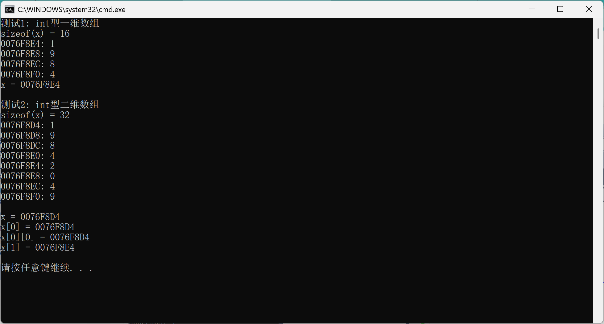 1 #include <stdio.h> 2 #define N 4 3 #define M 2 4 5 void test1() { 6 int x[N] = {1, 9, 8, 4}; 7 int i; 8 printf("sizeof(x) = %d\n", sizeof(x)); 9 for (i = 0; i < N; ++i) 10 printf("%p: %d\n", &x[i], x[i]); 11 printf("x = %p\n", x); 12 } 13 14 void test2() { 15 int x[M][N] = {{1, 9, 8, 4}, {2, 0, 4, 9}}; 16 int i, j; 17 printf("sizeof(x) = %d\n", sizeof(x)); 18 for (i = 0; i < M; ++i) 19 for (j = 0; j < N; ++j) 20 printf("%p: %d\n", &x[i][j], x[i][j]); 21 printf("\n"); 22 printf("x = %p\n", x); 23 printf("x[0] = %p\n", x[0]); 24 printf("x[1] = %p\n", x[1]); 25 printf("\n"); 26 } 27 28 int main() { 29 printf("测试1: int型一维数组\n"); 30 test1(); 31 32 printf("\n测试2: int型二维数组\n"); 33 test2(); 34 35 return 0; 36 }