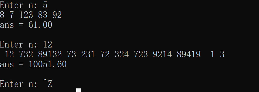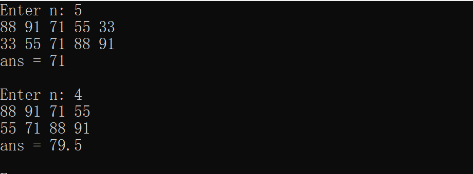 1 #include <stdio.h> 2 #define N 100 3 4 double median(int x[N],int n); 5 void input(int x[N], int n); 6 7 int main() { 8 int x[N]; 9 int n; 10 double ans; 11 12 while(printf("Enter n: "), scanf("%d", &n) != EOF) { 13 input(x, n); 14 ans = median(x, n); 15 printf("\nans = %g\n\n", ans); 16 } 17 18 return 0; 19 } 20 21 double median(int x[N],int n){ 22 int m=0,i,j; 23 double r; 24 for(j=0;j<n;j++){ 25 for(i=0;i<n-j-1;++i){ 26 if(x[i]>x[i+1]){ 27 m=x[i]; 28 x[i]=x[i+1]; 29 x[i+1]=m; 30 } 31 } 32 } 33 for(i=0;i<n;++i) 34 printf("%d ",x[i]); 35 36 if(n%2==0){ 37 r=(x[n/2]+x[n/2-1])/2.0; 38 39 } 40 else 41 r=x[(n-1)/2]; 42 43 return r; 44 } 45 void input(int x[N], int n) { 46 int i; 47 for(i = 0; i < n; ++i) 48 scanf_s("%d", &x[i]); 49 }
