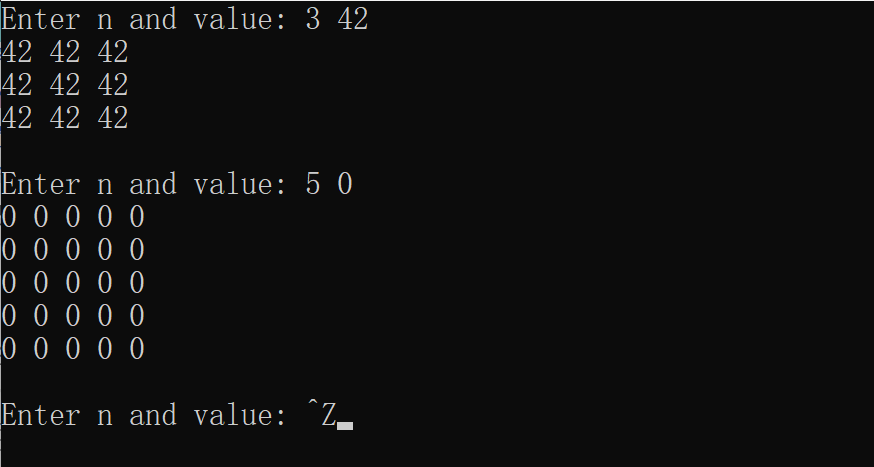 1 #include <stdio.h> 2 #define N 100 3 void output(int x[][N], int n); 4 void init(int x[][N], int n, int value); 5 int main() { 6 int x[N][N]; 7 int n, value; 8 9 while(printf("Enter n and value: "), scanf("%d%d", &n, &value) != EOF) { 10 init(x, n, value); 11 output(x, n); 12 printf("\n"); 13 } 14 return 0; 15 } 16 void output(int x[][N], int n) { 17 int i, j; 18 19 for(i = 0; i < n; ++i) { 20 for(j = 0; j < n; ++j) 21 printf("%d ", x[i][j]); 22 printf("\n"); 23 } 24 } 25 void init(int x[][N], int n, int value) { 26 int i, j; 27 28 for(i = 0; i < n; ++i) 29 for(j = 0; j < n; ++j) 30 x[i][j] = value; 31 }