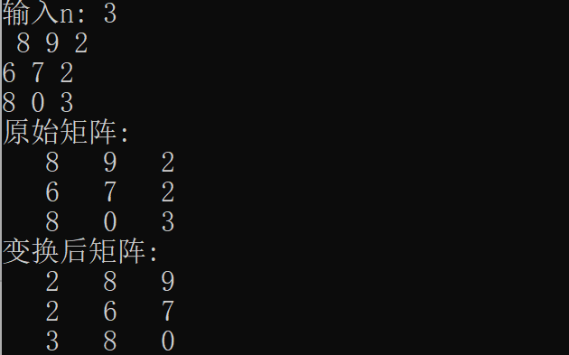 1 #include <stdio.h> 2 #define N 100 3 4 // 函数声明 5 void input(int x[][N], int n); 6 void output(int x[][N], int n); 7 void rotate_to_right(int x[][N], int n); 8 9 int main() { 10 int x[N][N]; 11 int n; 12 13 printf("输入n: "); 14 scanf("%d", &n); 15 input(x, n); 16 17 printf("原始矩阵:\n"); 18 output(x, n); 19 20 rotate_to_right(x,n); 21 22 printf("变换后矩阵:\n"); 23 output(x, n); 24 25 return 0; 26 } 27 28 void input(int x[][N], int n) { 29 int i, j; 30 31 for (i = 0; i < n; ++i) { 32 for (j = 0; j < n; ++j) 33 scanf("%d", &x[i][j]); 34 } 35 } 36 37 void output(int x[][N], int n) { 38 int i, j; 39 40 for (i = 0; i < n; ++i) { 41 for (j = 0; j < n; ++j) 42 printf("%4d", x[i][j]); 43 44 printf("\n"); 45 } 46 } 47 48 void rotate_to_right(int x[][N], int n){ 49 int i,j,r; 50 for(j=0;j<n;++j){ 51 r=x[j][n-1]; 52 for(i=n-1;i>0;--i){ 53 x[j][i]=x[j][i-1]; 54 } 55 x[j][0]=r; 56 } 57 58 }
