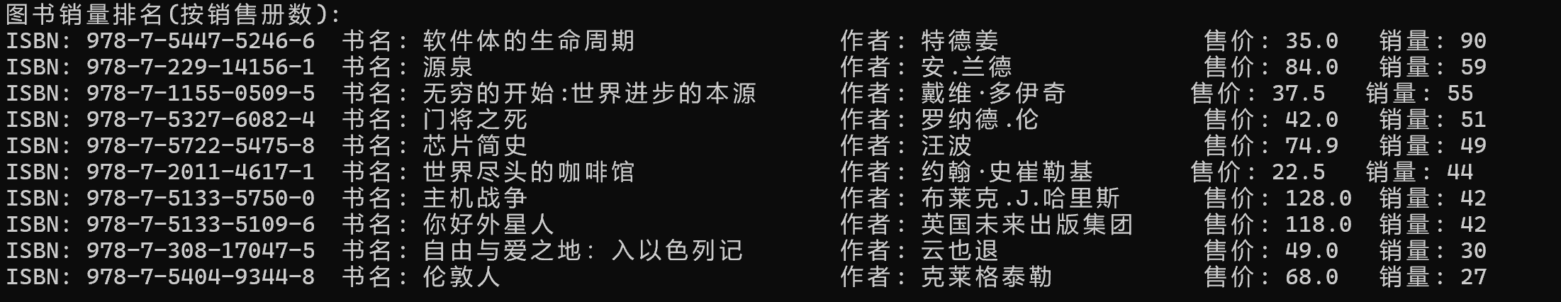 1 #include <stdio.h> 2 #define N 10 3 4 typedef struct { 5 char isbn[20]; // isbn号 6 char name[80]; // 书名 7 char author[80]; // 作者 8 double sales_price; // 售价 9 int sales_count; // 销售册数 10 } Book; 11 12 void output(Book x[], int n); 13 void sort(Book x[], int n); 14 double sales_amount(Book x[], int n); 15 16 int main() { 17 Book x[N] = {{"978-7-5327-6082-4", "门将之死", "罗纳德.伦", 42, 51}, 18 {"978-7-308-17047-5", "自由与爱之地:入以色列记", "云也退", 49 , 30}, 19 {"978-7-5404-9344-8", "伦敦人", "克莱格泰勒", 68, 27}, 20 {"978-7-5447-5246-6", "软件体的生命周期", "特德姜", 35, 90}, 21 {"978-7-5722-5475-8", "芯片简史", "汪波", 74.9, 49}, 22 {"978-7-5133-5750-0", "主机战争", "布莱克.J.哈里斯", 128, 42}, 23 {"978-7-2011-4617-1", "世界尽头的咖啡馆", "约翰·史崔勒基", 22.5, 44}, 24 {"978-7-5133-5109-6", "你好外星人", "英国未来出版集团", 118, 42}, 25 {"978-7-1155-0509-5", "无穷的开始:世界进步的本源", "戴维·多伊奇", 37.5, 55}, 26 {"978-7-229-14156-1", "源泉", "安.兰德", 84, 59}}; 27 28 printf("图书销量排名(按销售册数): \n"); 29 sort(x, N); 30 output(x, N); 31 32 printf("\n图书销售总额: %.2f\n", sales_amount(x, N)); 33 34 return 0; 35 } 36 37 void output(Book x[], int n) { 38 for (int i = 0; i < n; i++) { 39 printf("ISBN: %-18s 书名: %-30s 作者: %-20s 售价: %-6.1f 销量: %d\n", 40 x[i].isbn, x[i].name, x[i].author, x[i].sales_price, x[i].sales_count); 41 } 42 } 43 44 45 void sort(Book x[], int n) { 46 for (int i = 0; i < n - 1; i++) { 47 int max_index = i; 48 for (int j = i + 1; j < n; j++) { 49 if (x[j].sales_count > x[max_index].sales_count) { 50 max_index = j; 51 } 52 } 53 if (max_index != i) { 54 Book temp = x[i]; 55 x[i] = x[max_index]; 56 x[max_index] = temp; 57 } 58 } 59 } 60 61 62 double sales_amount(Book x[], int n) { 63 double total = 0; 64 for (int i = 0; i < n; i++) { 65 total += x[i].sales_price * x[i].sales_count; 66 } 67 return total; 68 }