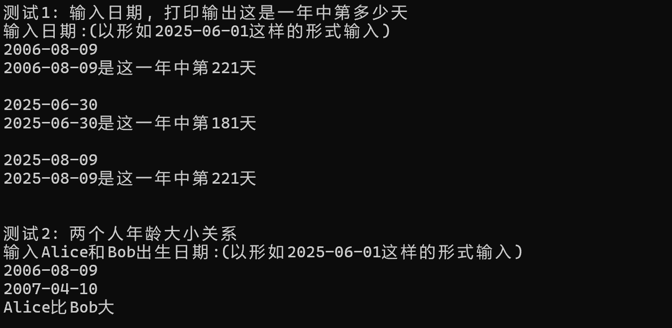 1 #include <stdio.h> 2 3 typedef struct { 4 int year; 5 int month; 6 int day; 7 } Date; 8 9 // 函数声明 10 void input(Date *pd); // 输入日期给pd指向的Date变量 11 int day_of_year(Date d); // 返回日期d是这一年的第多少天 12 int compare_dates(Date d1, Date d2); // 比较两个日期: 13 // 如果d1在d2之前,返回-1; 14 // 如果d1在d2之后,返回1 15 // 如果d1和d2相同,返回0 16 17 void test1() { 18 Date d; 19 int i; 20 21 printf("输入日期:(以形如2025-06-01这样的形式输入)\n"); 22 for(i = 0; i < 3; ++i) { 23 input(&d); 24 printf("%d-%02d-%02d是这一年中第%d天\n\n", d.year, d.month, d.day, day_of_year(d)); 25 } 26 } 27 28 void test2() { 29 Date Alice_birth, Bob_birth; 30 int i; 31 int ans; 32 33 printf("输入Alice和Bob出生日期:(以形如2025-06-01这样的形式输入)\n"); 34 for(i = 0; i < 3; ++i) { 35 input(&Alice_birth); 36 input(&Bob_birth); 37 ans = compare_dates(Alice_birth, Bob_birth); 38 39 if(ans == 0) 40 printf("Alice和Bob一样大\n\n"); 41 else if(ans == -1) 42 printf("Alice比Bob大\n\n"); 43 else 44 printf("Alice比Bob小\n\n"); 45 } 46 } 47 48 int main() { 49 printf("测试1: 输入日期, 打印输出这是一年中第多少天\n"); 50 test1(); 51 52 printf("\n测试2: 两个人年龄大小关系\n"); 53 test2(); 54 } 55 56 void input(Date *pd) { 57 scanf("%d-%d-%d", &pd->year, &pd->month, &pd->day); 58 } 59 60 61 int day_of_year(Date d) { 62 int days_in_month[] = {0, 31, 28, 31, 30, 31, 30, 31, 31, 30, 31, 30, 31}; 63 int total_days = 0; 64 if ((d.year % 4 == 0 && d.year % 100 != 0) || (d.year % 400 == 0)) { 65 days_in_month[2] = 29; 66 } 67 for (int i = 1; i < d.month; i++) { 68 total_days += days_in_month[i]; 69 } 70 total_days += d.day; 71 return total_days; 72 } 73 74 int compare_dates(Date d1, Date d2) { 75 if (d1.year < d2.year) return -1; 76 if (d1.year > d2.year) return 1; 77 if (d1.month < d2.month) return -1; 78 if (d1.month > d2.month) return 1; 79 if (d1.day < d2.day) return -1; 80 if (d1.day > d2.day) return 1; 81 return 0; 82 }