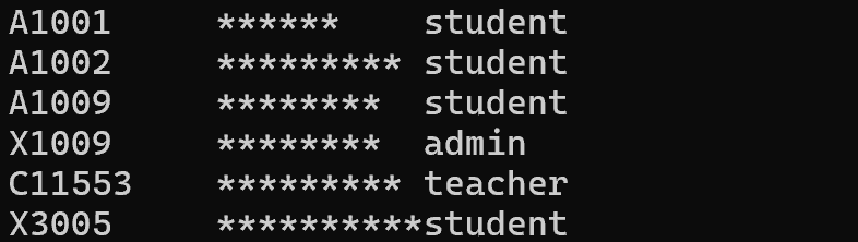 1 #include <stdio.h> 2 #include <string.h> 3 4 enum Role {admin, student, teacher}; 5 6 typedef struct { 7 char username[20]; // 用户名 8 char password[20]; // 密码 9 enum Role type; // 账户类型 10 } Account; 11 12 13 // 函数声明 14 void output(Account x[], int n); // 输出账户数组x中n个账户信息,其中,密码用*替代显示 15 16 int main() { 17 Account x[] = {{"A1001", "123456", student}, 18 {"A1002", "123abcdef", student}, 19 {"A1009", "xyz12121", student}, 20 {"X1009", "9213071x", admin}, 21 {"C11553", "129dfg32k", teacher}, 22 {"X3005", "921kfmg917", student}}; 23 int n; 24 n = sizeof(x)/sizeof(Account); 25 output(x, n); 26 27 return 0; 28 } 29 30 31 void output(Account x[], int n) { 32 for (int i = 0; i < n; i++) { 33 printf("%-8s ", x[i].username); 34 int len = strlen(x[i].password); 35 for (int j = 0; j < len; j++) { 36 printf("*"); 37 } 38 int total_chars = 8 + 2 + len; 39 if (total_chars < 20) { 40 for (int j = total_chars; j < 20; j++) { 41 printf(" "); 42 } 43 } 44 const char *typeStr; 45 switch (x[i].type) { 46 case admin: typeStr = "admin"; break; 47 case student: typeStr = "student"; break; 48 case teacher: typeStr = "teacher"; break; 49 default: typeStr = "unknown"; break; 50 } 51 printf("%s\n", typeStr); 52 } 53 }