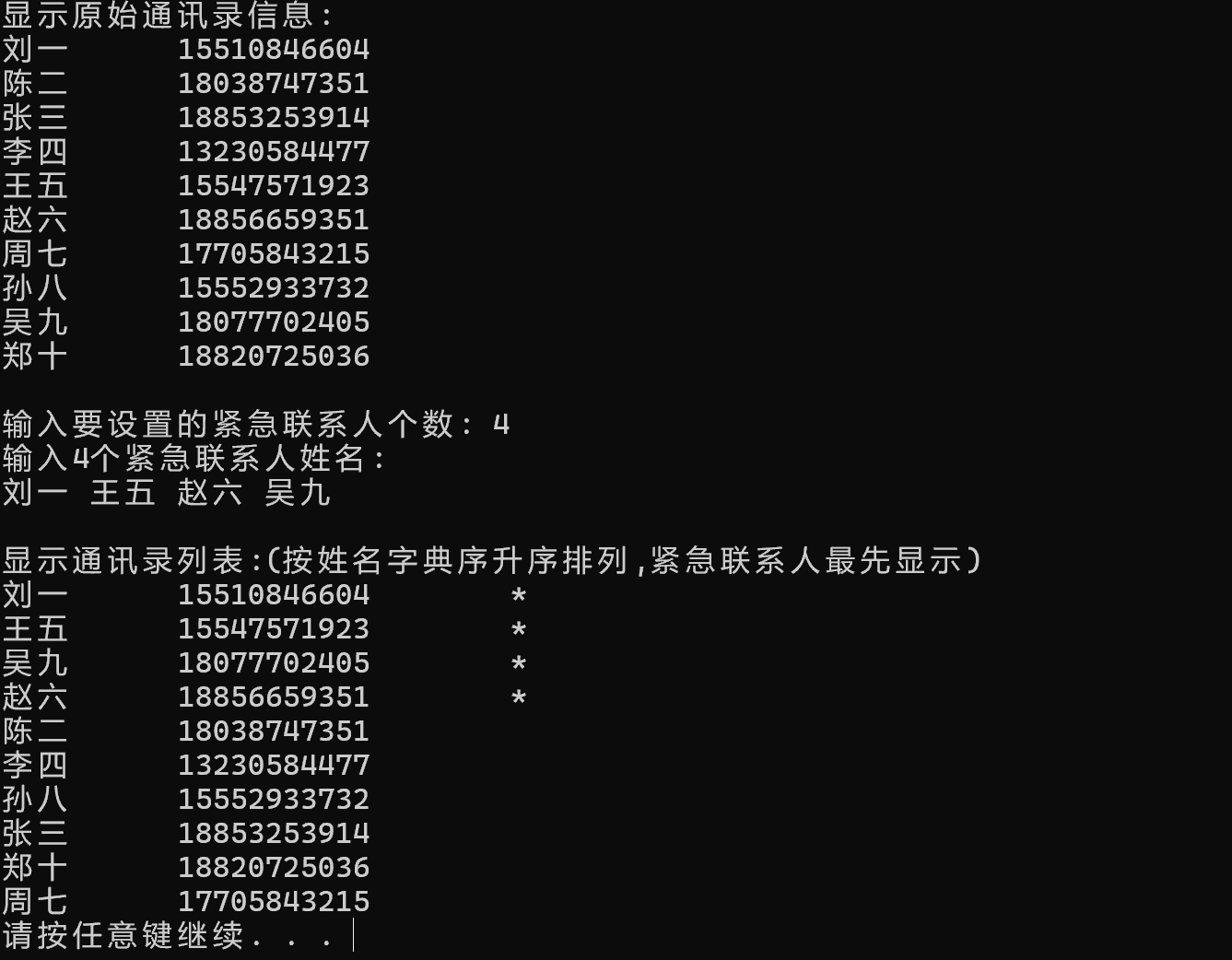 1 #include <stdio.h> 2 #include <string.h> 3 4 typedef struct { 5 char name[20]; // 姓名 6 char phone[12]; // 手机号 7 int vip; // 是否为紧急联系人,是取1;否则取0 8 } Contact; 9 10 11 // 函数声明 12 void set_vip_contact(Contact x[], int n, char name[]); // 设置紧急联系人 13 void output(Contact x[], int n); // 输出x中联系人信息 14 void display(Contact x[], int n); // 按联系人姓名字典序升序显示信息,紧急联系人最先显示 15 16 17 #define N 10 18 int main() { 19 Contact list[N] = {{"刘一", "15510846604", 0}, 20 {"陈二", "18038747351", 0}, 21 {"张三", "18853253914", 0}, 22 {"李四", "13230584477", 0}, 23 {"王五", "15547571923", 0}, 24 {"赵六", "18856659351", 0}, 25 {"周七", "17705843215", 0}, 26 {"孙八", "15552933732", 0}, 27 {"吴九", "18077702405", 0}, 28 {"郑十", "18820725036", 0}}; 29 int vip_cnt, i; 30 char name[20]; 31 32 printf("显示原始通讯录信息: \n"); 33 output(list, N); 34 35 printf("\n输入要设置的紧急联系人个数: "); 36 scanf("%d", &vip_cnt); 37 38 printf("输入%d个紧急联系人姓名:\n", vip_cnt); 39 for(i = 0; i < vip_cnt; ++i) { 40 scanf("%s", name); 41 set_vip_contact(list, N, name); 42 } 43 44 printf("\n显示通讯录列表:(按姓名字典序升序排列,紧急联系人最先显示)\n"); 45 display(list, N); 46 47 return 0; 48 } 49 50 void set_vip_contact(Contact x[], int n, char name[]) { 51 for (int j=0; j < n; ++j) { 52 if (strcmp(name, x[j].name) == 0) { 53 x[j].vip = 1; 54 } 55 } 56 } 57 void display(Contact x[], int n) { 58 Contact temp; 59 for (int i = 0; i < n-1; ++i) { 60 for (int j = 0; j < n - i - 1; ++j) { 61 if (strcmp(x[j].name,x[j+1].name)>0) { 62 temp = x[j]; 63 x[j] = x[j + 1]; 64 x[j + 1] = temp; 65 } 66 } 67 } 68 // ××× 69 for (int k = 0; k < n; ++k) { 70 if (x[k].vip == 1) { 71 printf("%-10s%-15s *\n", x[k].name, x[k].phone); 72 } 73 } 74 for (int m = 0; m < n; ++m) { 75 if (x[m].vip == 0) { 76 printf("%-10s%-15s\n", x[m].name, x[m].phone); 77 } 78 } 79 } 80 81 void output(Contact x[], int n) { 82 int i; 83 for (i = 0; i < n; ++i) { 84 printf("%-10s%-15s", x[i].name, x[i].phone); 85 if (x[i].vip) 86 printf("%5s", "*"); 87 printf("\n"); 88 } 89 }
