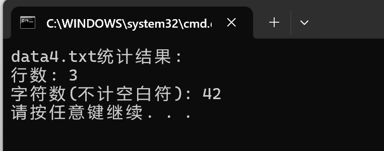 1 #include<stdio.h> 2 #define N 100 3 int main(){ 4 FILE *fp= fopen("D:\\data4.txt", "r"); 5 if(!fp) { 6 printf("fail to open file to read\n"); 7 return 1; 8 } 9 int count1=0,count2=0,i; 10 char s[N]; 11 while(fgets(s,N,fp)){ 12 count1++; 13 i=0; 14 while(s[i]!='\0'){ 15 if(s[i] != ' ' && s[i] != '\t' && s[i] != '\n'){ 16 count2++; 17 } 18 i++; 19 } 20 } 21 fclose(fp); 22 printf("data4.txt统计结果:\n"); 23 printf("行数: %d\n", count1); 24 printf("字符数(不计空白符): %d\n", count2); 25 return 0; 26 }