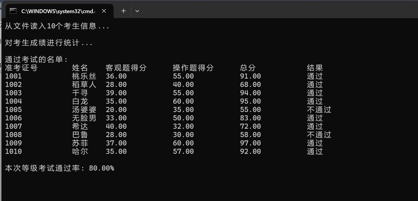 1 #include <stdio.h> 2 #include <string.h> 3 4 #define N 10 5 6 typedef struct { 7 long id; // 准考证号 8 char name[20]; // 姓名 9 float objective; // 客观题得分 10 float subjective; // 操作题得分 11 float sum; // 总分 12 char result[10]; // 考试结果 13 } STU; 14 15 // 函数声明 16 void read(STU st[], int n); 17 void write(STU st[], int n); 18 void output(STU st[], int n); 19 int process(STU st[], int n, STU st_pass[]); 20 21 int main() { 22 STU stu[N], stu_pass[N]; 23 int cnt; 24 double pass_rate; 25 26 printf("从文件读入%d个考生信息...\n", N); 27 read(stu, N); 28 29 printf("\n对考生成绩进行统计...\n"); 30 cnt = process(stu, N, stu_pass); 31 32 printf("\n通过考试的名单:\n"); 33 output(stu, N); // 输出所有考生完整信息到屏幕 34 write(stu, N); // 输出考试通过的考生信息到文件 35 36 pass_rate = 1.0 * cnt / N; 37 printf("\n本次等级考试通过率: %.2f%%\n", pass_rate*100); 38 39 return 0; 40 } 41 42 // 把所有考生完整信息输出到屏幕上 43 // 准考证号,姓名,客观题得分,操作题得分,总分,结果 44 void output(STU st[], int n) { 45 int i; 46 47 printf("准考证号\t姓名\t客观题得分\t操作题得分\t总分\t\t结果\n"); 48 for (i = 0; i < n; i++) 49 printf("%ld\t\t%s\t%.2f\t\t%.2f\t\t%.2f\t\t%s\n", st[i].id, st[i].name, st[i].objective, st[i].subjective, st[i].sum, st[i].result); 50 } 51 52 // 从文本文件examinee.txt读入考生信息:准考证号,姓名,客观题得分,操作题得分 53 void read(STU st[], int n) { 54 int i; 55 FILE *fin; 56 57 fin = fopen("examinee.txt", "r"); 58 if (!fin) { 59 printf("fail to open file\n"); 60 return; 61 } 62 63 while (!feof(fin)) { 64 for (i = 0; i < n; i++) 65 fscanf_s(fin, "%ld %s %f %f", &st[i].id, st[i].name, &st[i].objective, &st[i].subjective); 66 } 67 68 fclose(fin); 69 } 70 71 // 把通过考试的考生完整信息写入文件list_pass.txt 72 // 准考证号,姓名,客观题得分,操作题得分,总分,结果 73 void write(STU s[], int n) { 74 int i; 75 FILE *fin; 76 fin=fopen("D:\\list_pass.txt", "w"); 77 if (!fin) { 78 printf("fail to open file\n"); 79 return; 80 } 81 82 fprintf(fin,"准考证号\t姓名\t\t客观题得分\t\t操作题得分\t\t总分\t\t结果\n"); 83 for (i = 0; i < n; i++) { 84 if(s[i].sum>=60) 85 fprintf(fin,"%ld\t\t%s\t%.2f\t\t%.2f\t\t%.2f\t\t%s\n", s[i].id, s[i].name, s[i].objective, s[i].subjective, s[i].sum, s[i].result); 86 } 87 fclose(fin); 88 89 // 对考生信息进行处理:计算每位考生考试总分、结果;统计考试通过的人数 90 int process(STU st[], int n, STU st_pass[]){ 91 int passnum=0; 92 int i; 93 int j=0; 94 for(i=0;i<n;i++) { 95 st[i].sum=st[i].subjective+st[i].objective; 96 if(st[i].sum>=60) { 97 strcpy(st[i].result,"通过"); 98 99 st_pass[j]=st[i]; 100 j++; 101 passnum++; 102 } 103 else 104 strcpy(st[i].result,"不通过"); 105 } 106 return passnum; 107 }
