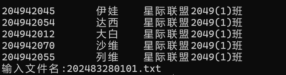 1 #include <stdio.h> 2 #include <stdlib.h> 3 #include <time.h> 4 #define N 80 5 6 void read(); 7 8 int main() 9 { 10 char info[N][80]; 11 int lucky_index; 12 int flag[N]; 13 14 15 FILE *fp=fopen("D:\\list.txt","r"); 16 if(fp==NULL) 17 { 18 printf("fail to open file to read\n"); 19 return 1; 20 } 21 int i; 22 for(i=0;i<N;i++) 23 fgets(info[i],80,fp); 24 fclose(fp); 25 26 srand((unsigned int)time(NULL)); 27 for(i=0;i<5;i++) 28 { 29 lucky_index = rand() % N; 30 printf("%s",info[lucky_index]); 31 } 32 33 FILE *fin=fopen("D:\\202483280101.txt","r"); 34 fin=fopen("D:\\202483280101.txt","w"); 35 int j; 36 for(j=0;j<i;j++) 37 fputs(info[j],fin); 38 fclose(fin); 39 printf("输入文件名:202483280101.txt\n"); 40 printf("保存成功!"); 41 return 0; 42 }