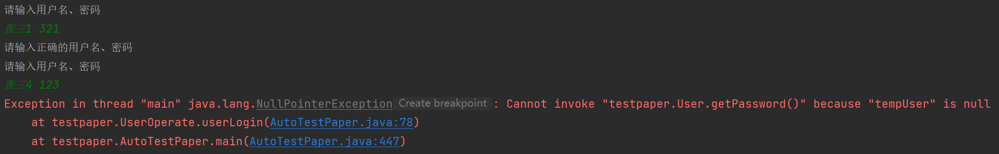 比如,此处用if语句对密码进行了校验,却没有对用户名进行校验,导致输入错误的用户名时,会因为缺少处理而报错;