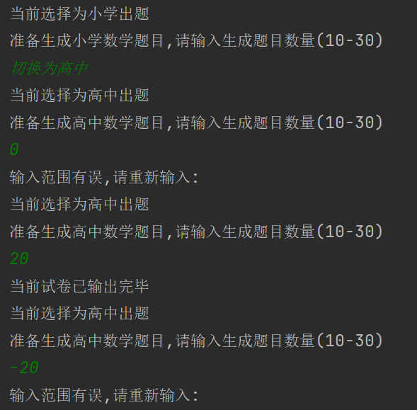 4、在登录状态下,如果用户需要切换类型选项,命令行输入“切换为XX”,XX为小学、初中和高中三个选项中的一个,输入项不符合要求时,程序控制台提示“请输入小学、初中和高中三个选项中的一个”;输入正确后,显示“”系统提示“准备生成XX数学题目,请输入生成题目数量”,用户输入所需出的卷子的题目数量,系统新设置的类型进行出题;