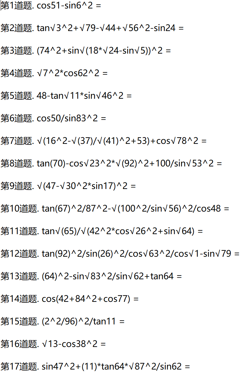 备注 只能有+,-,*./和() 题目中至少有一个平方或开根号的运算1=符 题目中至少有一个sin,cos或tan的运算符