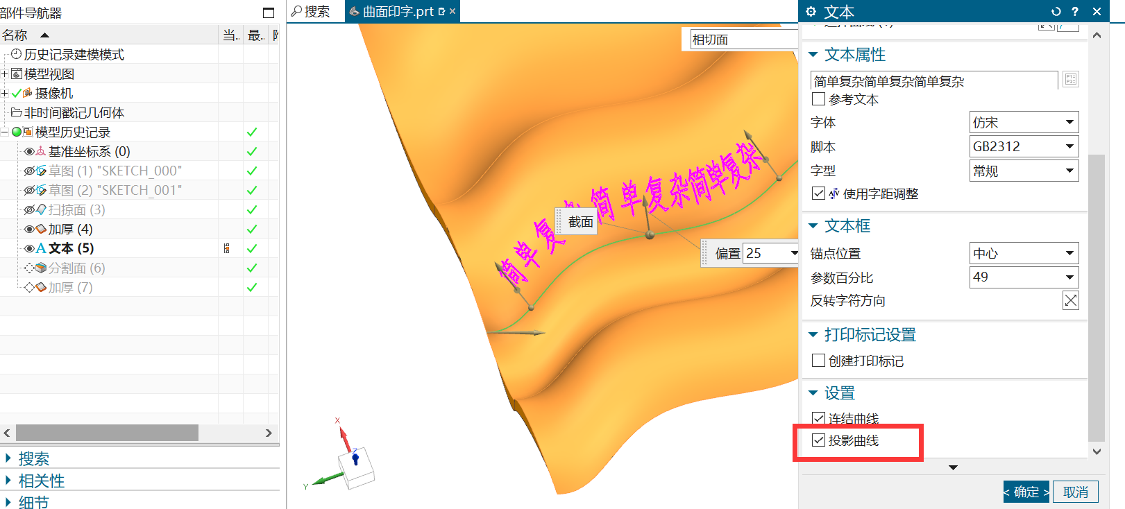 曲面上和圆柱面上印字的方法二基本上是一样的;注意点就是,文字放置的时候,需要勾选投影曲线,否则无法用文字分割面(如下图右)。