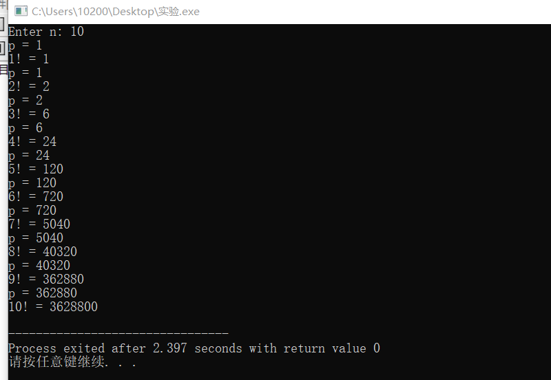 #include <stdio.h> long long fac(int n); int main() { int i,n; printf("Enter n: "); scanf("%d", &n); for(i=1; i<=n; ++i) printf("%d! = %lld\n", i, fac(i)); return 0; } long long fac(int n) { static long long p = 1; p = p*n; return p; }
