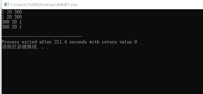 #include <stdio.h> #include <stdlib.h> const int N=3; int main() { int a[N]; int *p,i; for(p=a; p<a+N; p++) scanf("%d", p); for(p=a; p<a+N; p++) printf("%d ", *p); printf("\n"); p = a; for(i=0; i<N; i++) scanf("%d", p+i); for(i=0; i<N; i++) printf("%d ", *(p+i)); printf("\n"); return 0; }