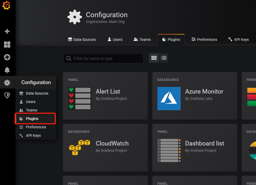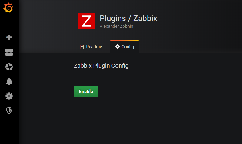 确定自己已经打开grafana-server服务后,打开http://localhost:3000 。在左侧找到plugins,点击后,往下翻找到Zabbix插件后,点击里面的Config选项卡,点击绿色Enable按钮启用插件。
