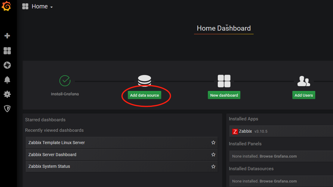 点击左上角太阳logo,进入主页,点击Add data source按钮,找到最下面,添加一个Zabbix数据源。