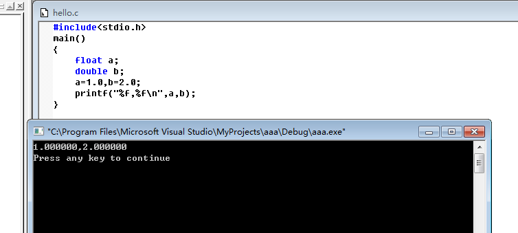 #include<stdio.h> main() { float a; double b; a=1.0,b=2.0; printf("%f,%f\n",a,b); }