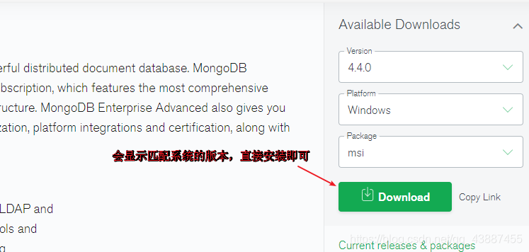这是安装 MongoDB 的服务。这是 4 之后的版本有的,这里安装了以后,就不用配置 dbpath 和 logpath,也不用配置服务了。安装完了,就直接可以使用 MongoDB。