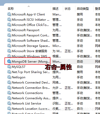 3)找到找到 MongoDB Server,然后右击该项,选择属性