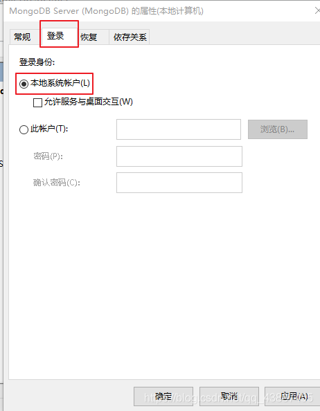 打开 MongoDB server 服务的属性,选择登录选项,将登录身份从“此账户”修改为本地系统账户。再回到安装页面点击 Retry。最后点击 Finish 即安装安装。