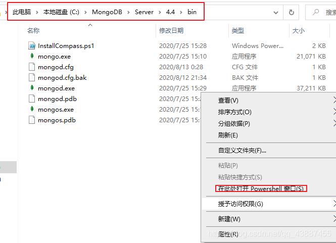 (1)2 中的(5)步骤直接点击 ignore,安装完之后进入 MongoDB Server 的安装路径的 bin 目录下,然后在空白处 shift+鼠标右键,选择“在此处打开命令窗口”或者“在此处打开 Powershell 窗口”