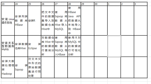 | 任务清单 | 1. 安装Linux系统;2. 安装Hadoop;3. 安装MySQL;4. 安装HBase;5. 安装Hive;6. 安装Sqoop;7. 安装R;8. 安装Eclipse |