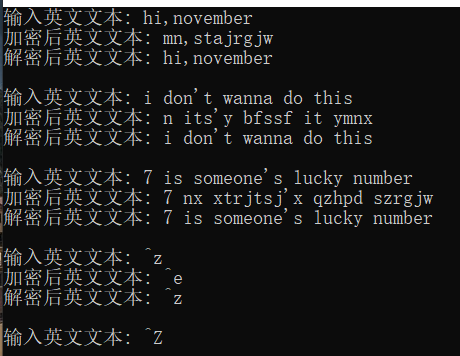 #include "TextCoder.hpp" #include <iostream> #include <string> int main() { using namespace std; string text, encoded_text, decoded_text; cout << "输入英文文本: "; while (getline(cin, text)) { encoded_text = TextCoder(text).encoder(); // 这里使用的是临时无名对象 cout << "加密后英文文本:\t" << encoded_text << endl; decoded_text = TextCoder(encoded_text).decoder(); // 这里使用的是临时无名对象 cout << "解密后英文文本:\t" << decoded_text << endl; cout << "\n输入英文文本: "; } }