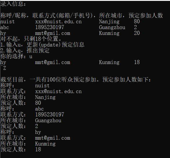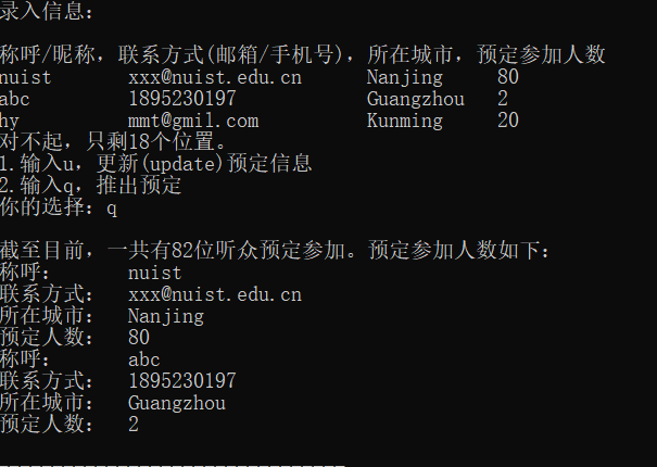 #include"Info.hpp" #include<iostream> #include<string> #include<vector> const int capacity=100; static int count=0; int main() { vector<Info> audience_info_list; string nickname0,contact0,city0; int n0; Info s; char c; cout<<"录入信息:"<<endl<<endl; cout<<"称呼/昵称,联系方式(邮箱/手机号),所在城市,预定参加人数"<<endl; while(cin>>nickname0>>contact0>>city0>>n0) { int temp=count; s=Info(nickname0,contact0,city0,n0); if(temp+n0<=capacity) { count+=n0; audience_info_list.push_back(s); } else { cout<<"对不起,只剩"<<capacity-count<<"个位置。"<<endl; cout<<"1.输入u,更新(update)预定信息"<<endl; cout<<"2.输入q,推出预定"<<endl; cout<<"你的选择:" ; cin>>c; if(c=='q') break; } } cout<<endl; cout<<"截至目前,一共有"<<count<<"位听众预定参加。预定参加人数如下:"<<endl; for(auto x:audience_info_list) x.print(); return 0; }