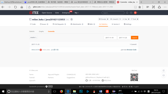 在码云的项目中,依次选择“统计-Commits历史-设置时间段”, 然后搜索并截图
