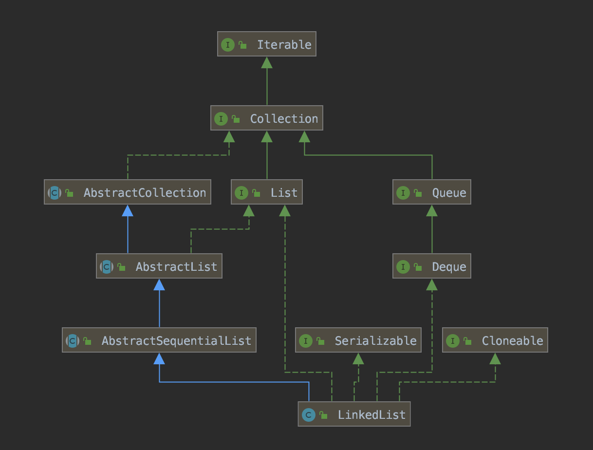 LinkedList 实现的接口、继承的抽象类,如下图所示: