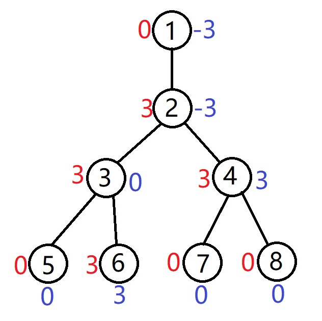 举个例子:如图,假设起始状态点权均为0,则差分值也均为0