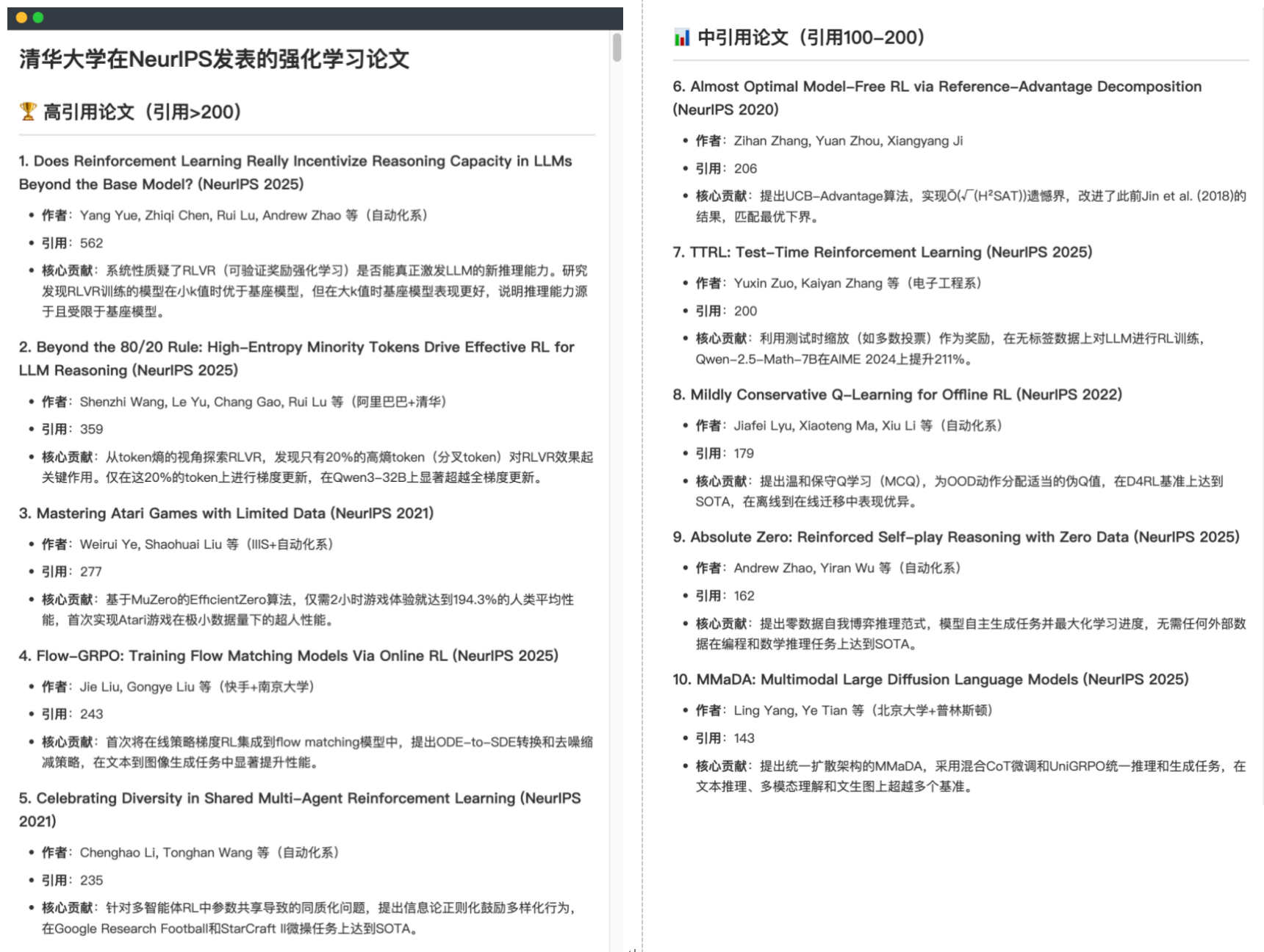 例如:搜索”2020年后清华大学在 NeurIPS 发表的强化学习论文”