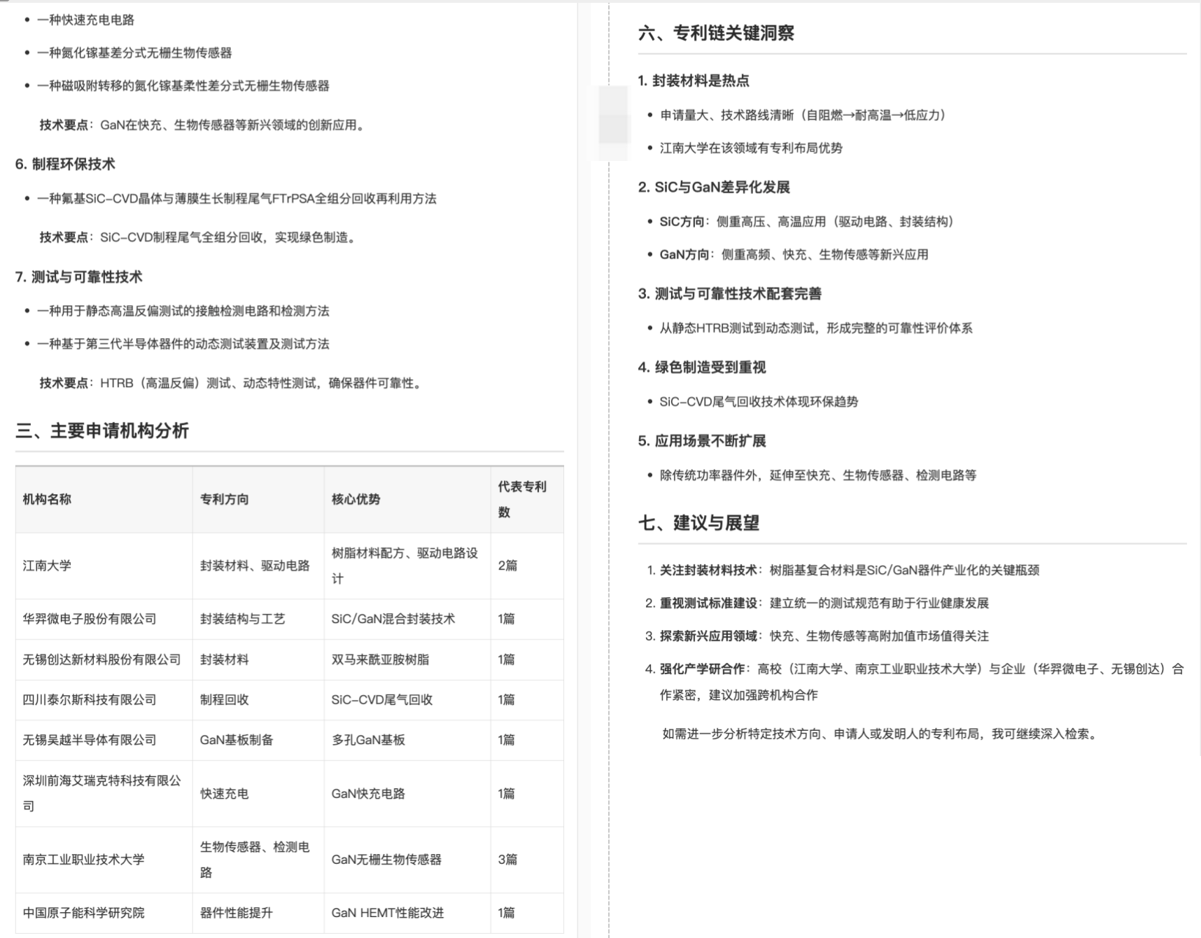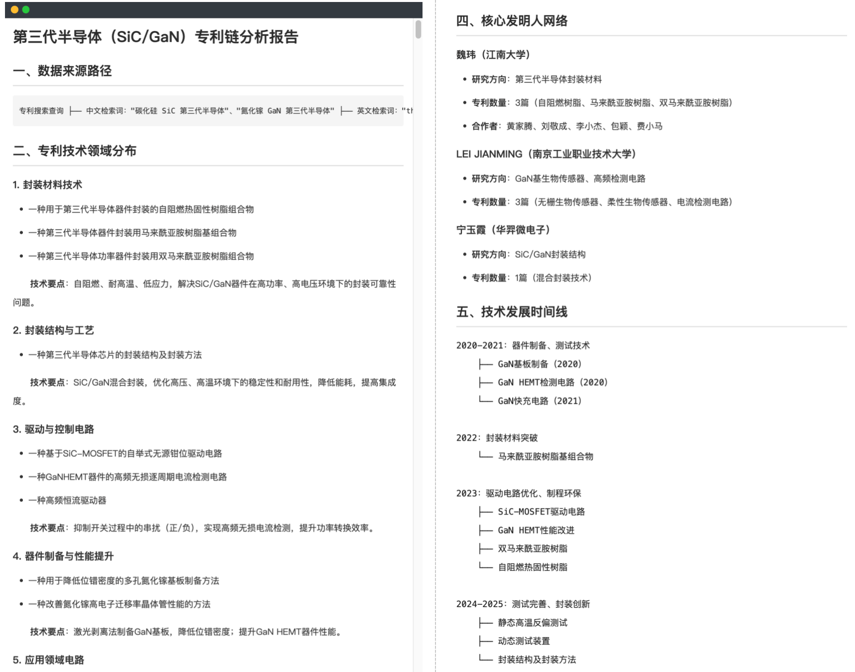 例如:输入“做一下第三代半导体(SiC/GaN)专利链分析”