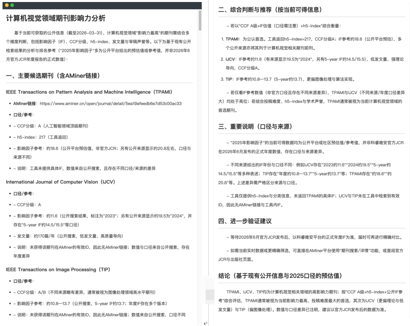 例如:输入“2025年Q1 计算机视觉领域影响力最高的期刊是什么?”