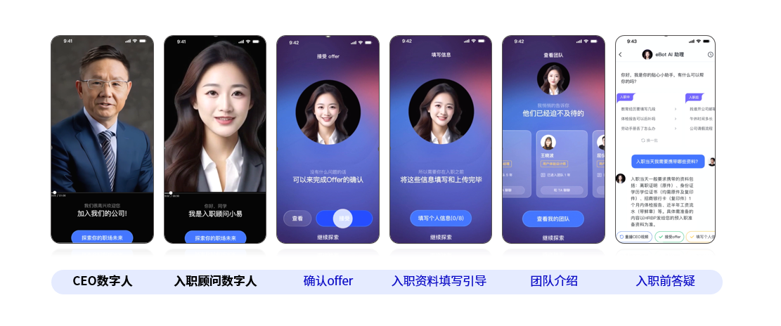 该企业引入iBuilder入职数字助理来服务全国近千家门店的新员工入职办理事务,自候选人收到Offer流程便自动开启,准雇员通过Offer邮件中的链接登录后首先收到CEO形象的数字人迎新,让准雇员充分感受到企业的重视,对新工作充满期待。