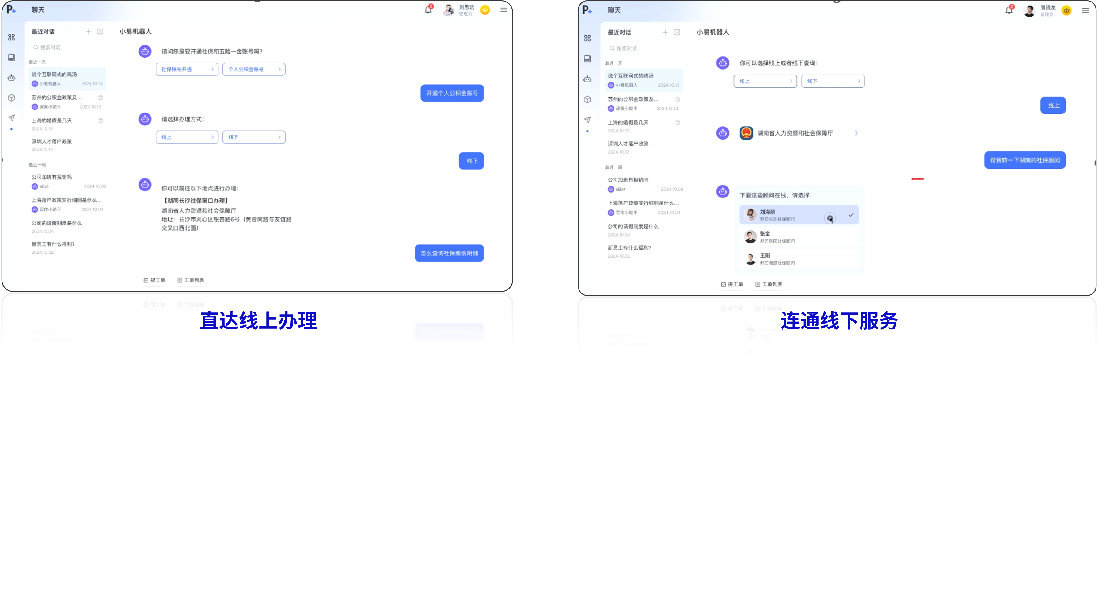 依托易路沉淀20余年的全国政策知识库,iBuilder智慧共享服务中心的加持下,HR无需到处查询,可直接在对话窗口发起问询,由机器人基于政策库给出精准答复并标明来源出处。对于可线上办理的业务,HR可通过机器人提供的网址直接跳转至地方政府办理网点处理;对于线上无法触达的地区或业务,HR可通过对话框直达当地业务专家发起咨询并下工单,服务进度全流程可视、可追踪。