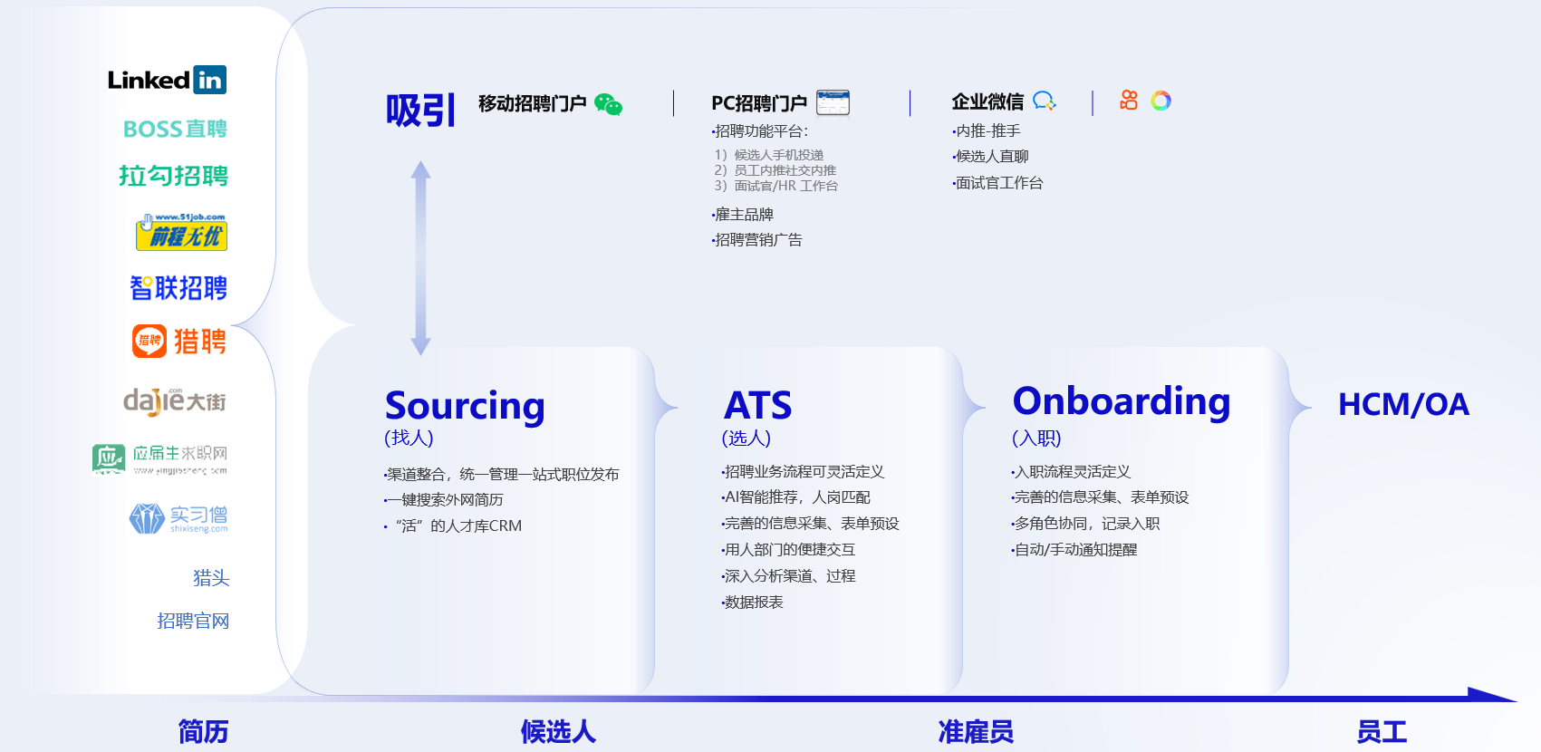 以智能化能力为底层支撑,方案实现【人才吸引】-【找人】-【选人】-【入职】全链路、智能化的管理闭环,一举消除传统招聘场景中依附人力操作、人为判断等不足。