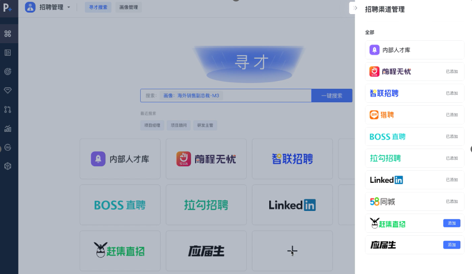 方案实现微信朋友圈、招聘网站、猎头推荐、社交媒体等外部简历渠道,结合企业内部推荐、调岗、人才地图等内部人才库,打破单一寻才模式。