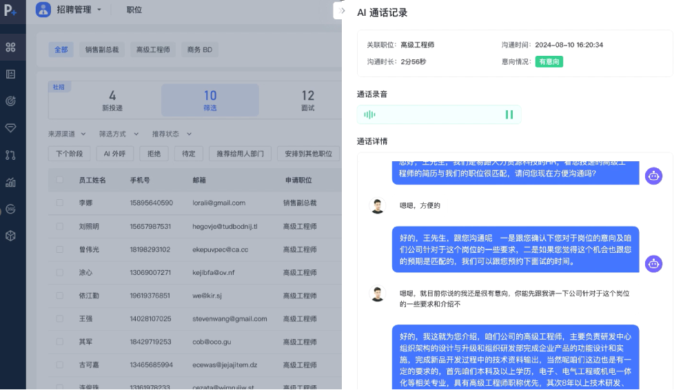 AI智能面试:借助AI视频面试,满足候选人了解岗位及时性需要,同时解决招聘专员面试候选人在时间、地点等方面的限制,有效释放人力;