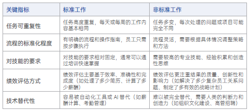 非标准工作,则指任务内容灵活多变,需要创造性思维、复杂决策和个性化处理。主要特点为:任务不固定,依赖员工的技能和经验;难以通过标准化流程完全覆盖。该类工作绩效评估更注重结果的质量和创新性。典型场景如战略人力资源规划、组织文化建设、员工关系调解、高管招聘等。