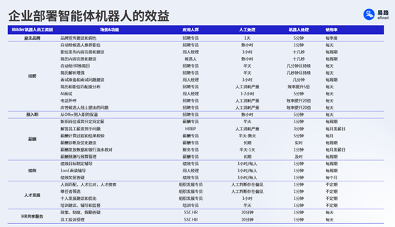在HR服务商大力融合AI技术,持续迭代AI HR产品的当下,预计在3-6个月内,招聘Agent、培训Agent、绩效管理Agent、继任规划Agent等将在企业中逐步普及,并覆盖员工服务的全场景。通过数据整合与生成能力,AI可替代HR约50%-75%的工作。
