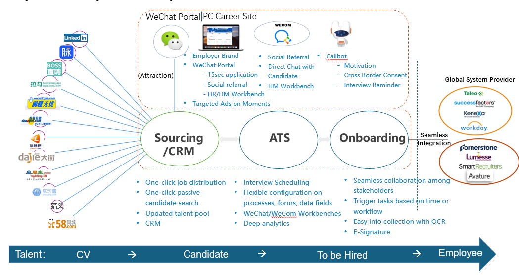 ●对外资企业而言,中国市场是不可或缺的一部分,但在推进国内市场人才队伍建设过程中,外资企业无法通过Global招聘系统完成国内招聘网站的职位发布、投递简历回收、被动简历搜索/下载/聊天等;